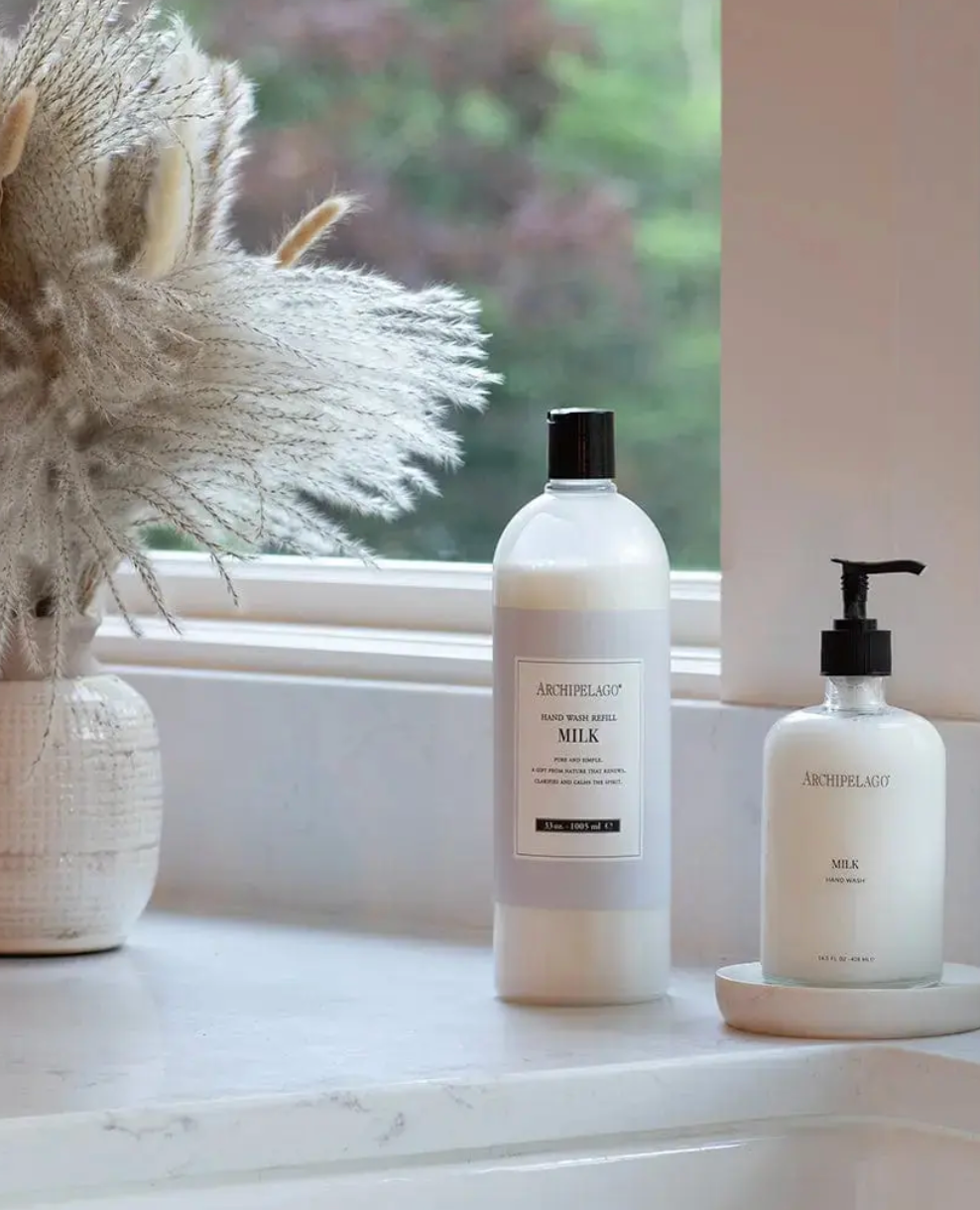 Regular price $20.00Our Milk Hand Wash is the ideal nourishing soap to keep your hands healthy and clean. Enriched with dried milk solids and natural proteins from soy, oat, and rice, this unique formula offers a nourishing experience you'll love from the very first use. The product is packaged in a recyclable glass bottle that can be refilled with our 33 oz Hand Wash Refill, offering an eco-friendly solution that enhances both your skincare routine and your commitment to sustainability.