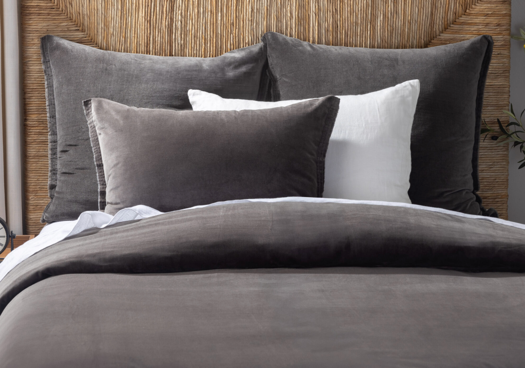 The beauty is in the details: constructed envelope style, the fabric for the duvet and shams is simply folded in half for a soft edge along the top, then double needle stitched down both sides, with exposed frayed edges.